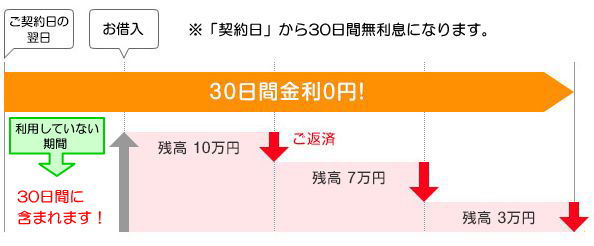 | アコム | 新規契約1度限り、契約日より30日間無利息 ※契約日から30日間が無利息 |