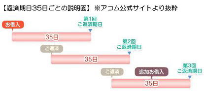 アコムでは、会員のための「eメールサービス」があり、毎月定期的に返済日の案内をしています。返済日を「35日ごと」にした場合、前回返済から35日目が返済期日になりますので、支払日は毎月変わってきます。