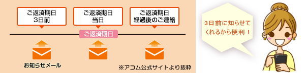 なお、返済日を通知するメールサービスは他にもありますが、アコムの場合は期日の3日前、当日、期日後の3回送られてきます。件名もACサービスセンターとなっているのでアコムとは気づかれにくくなっています。