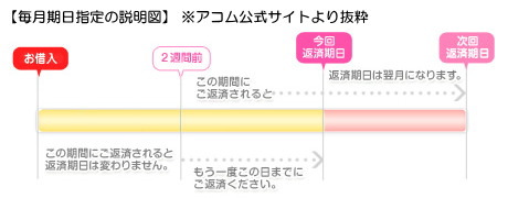「毎月指定期日」での返済の場合、アコムでは次回返済日の15日以上前に返済されたものは、翌月に返済期日が繰り越しになりません。