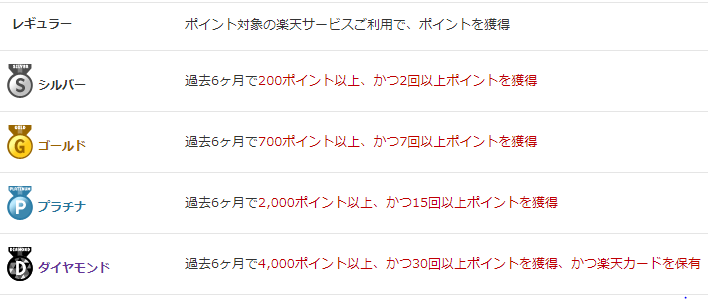 楽天会員は、楽天スーパーポイントの獲得点数や獲得回数に応じて会員ランクが定められています。