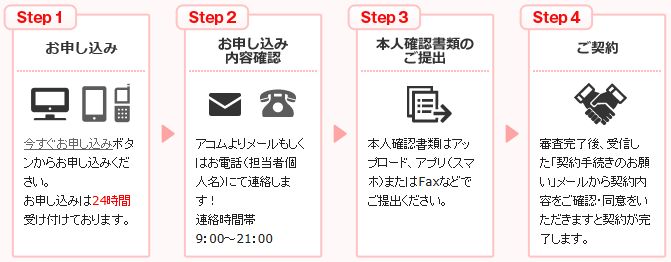 申込み方法はインターネット以外に電話・店頭窓口・自動契約機・郵送があります。申込み当日に即日振込融資を受ける為には、STEP3の本人確認書類を平日14時までにアコムが確認することが条件となります。