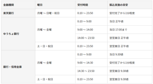 また、口座に振り込んでもらう場合は、基本的に14時30分までに振込依頼を完了している必要があります。しかし、楽天銀行の口座を持っている場合はほぼ24時間(0時10分~23時50分)対応してもらえるので、楽天銀行の口座を持っている人にはおすすめです。
